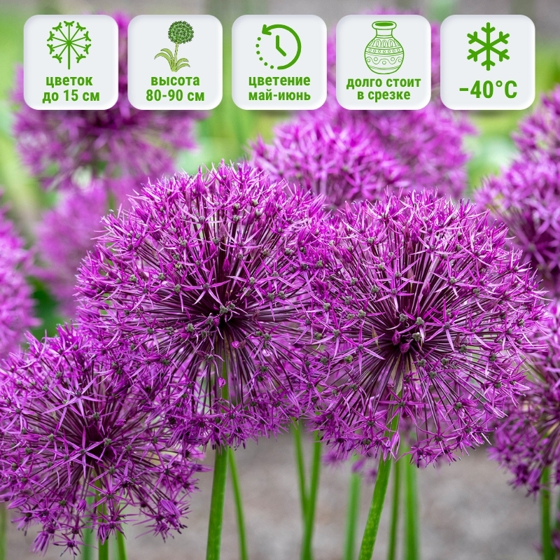 Цветёт в конце весны – начале лета, образуя сферические соцветия диаметром до 15 см. Соцветия состоят из многочисленных мелких цветков, которые придают растению легкость и ажурность. Листья узкие, линейные, зелёного цвета, отмирают к моменту цветения, что характерно для большинства декоративных луков. Это многолетнее луковичное растение, достигающее высоты около 85-100 см.Где высаживать и с какими растениями сочетать: