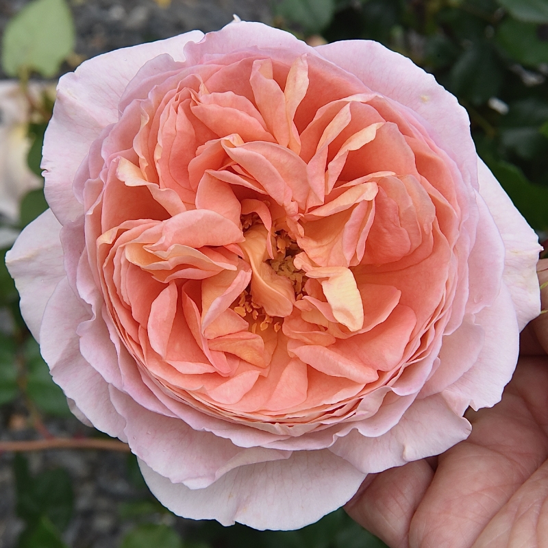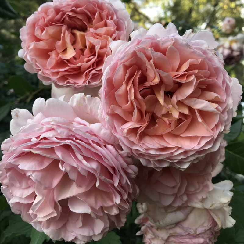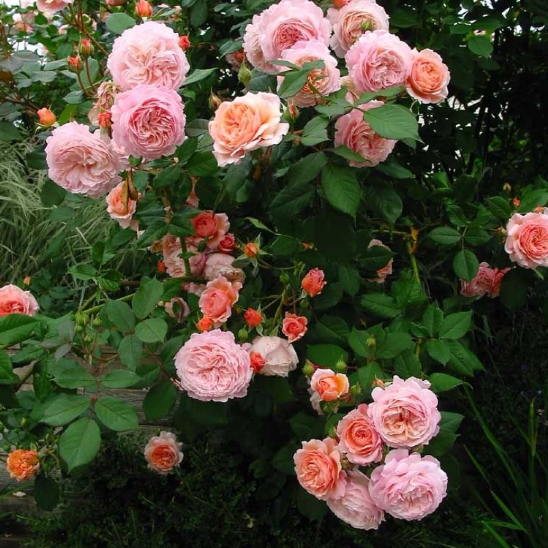 Бутоны этой розы имеют более желтый оттенок, хотя при роспуске лепестки приобретают более розовые тона. Вообще, розу Abraham Darby можно назвать хамелеоном, так как в зависимости от погоды и климата, где она растет, ее цветки могут принимать оттенки от персикового до розового. Цветки густо-махровые, чашевидной формы, со слегка отогнутыми внешними лепестками и идеальной розеткой, довольно крупные с насыщенным волшебным ароматом. Запах розы Абрахам Дерби по истине, не забываем, по мере роспуска роз сила аромата увеличивается, может сочетать в себе нотки мускуса и любимых фруктов. Крупные, до 14 см, цветки часто поникают на ровных побегах этих роз, цветение у розы неоднократное и обильное.