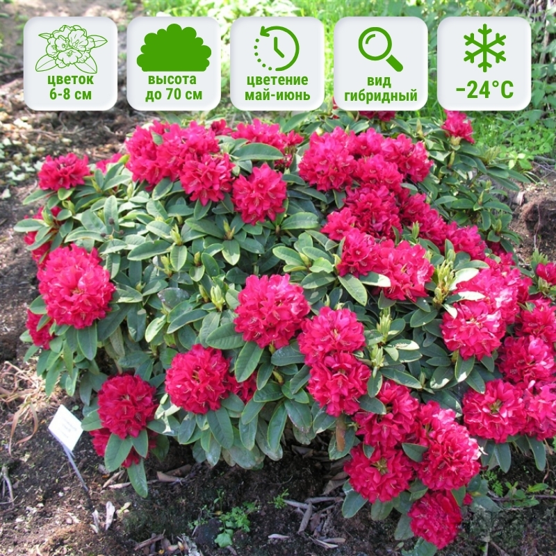 Данный гибрид отличает медленный рост и компактный размер. Куст высотой 50-70 см и шириной 90-130 см, лист зеленый плотный. Цветение начинается в середине мая и продолжается до июня, когда куст покрывается обильными чисто-красными цветками. Диаметр цветов 6-8 см, аромат отсутствует. Растение обладает средней зимостойкостью до -24 °C, подходит для выращивания в регионах с умеренным климатом.Универсальность использования в саду