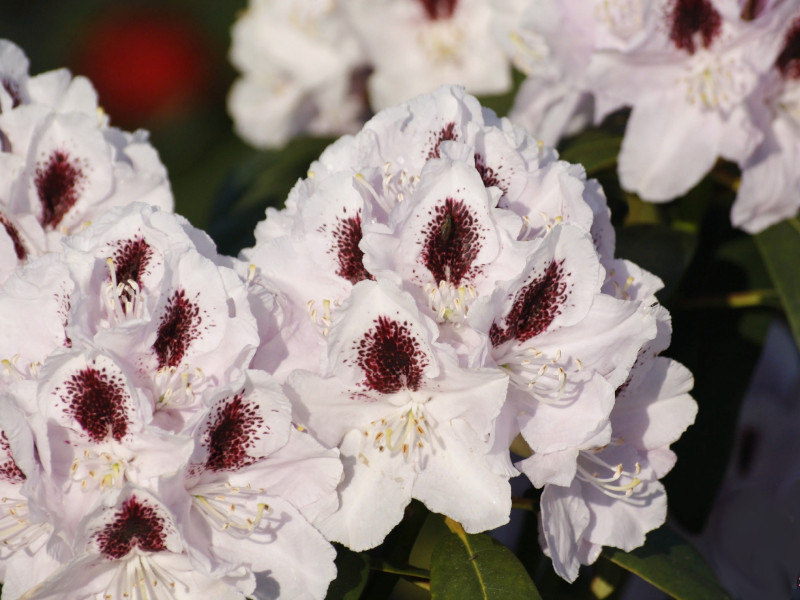 Цветет рододендрон Calsap с конца мая и весь июнь. Куст в это время усыпан соцветиями из 10-15 довольно крупных цветков диаметром до 10 см. Цветки белые с отчетливо видными красными или ярко-пурпурными крапинками. Это создает растению необычайную эффектность и неповторимость. Цветет сорт дружно, между молодыми и старыми цветками чередование отсутствует.