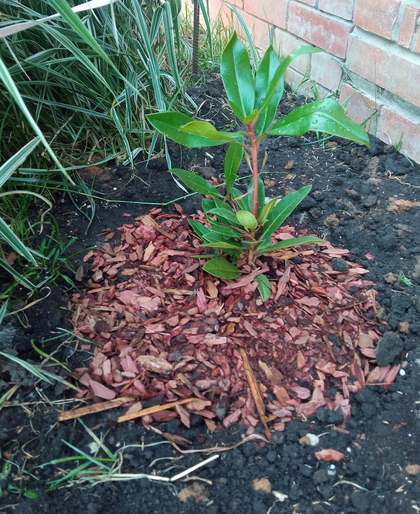 Посадка рододендрона производится в яму, превышающую корневую систему в 3-4 раза. От 50 см глубиной и около 1 м шириной. В дно кладут керамзит или гравий, затем наполняют на половину почвосмесью, устанавливают саженец, расправляют корни и вновь засыпают оставшейся почвой. Сверху обильно поливают и мульчируют хвойным опадом, торфом или вересковой землей минимум 4 см. В зависимости от сорта, расстояние между кустами занимает 70-200 см.