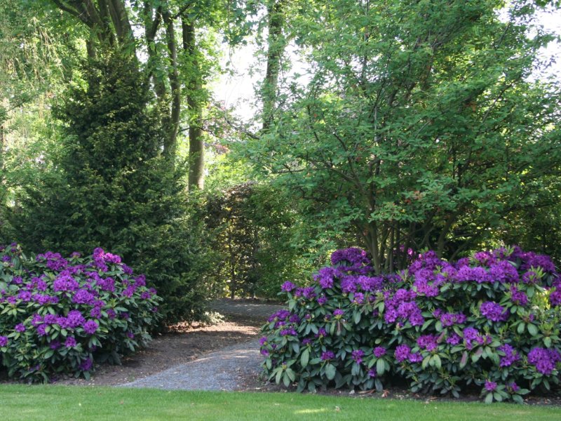 Аппетитный сливовый цвет наряжает куст рододендрона гибридного Распутин (Rasputin) каждый май. Его густая округлая крона и блестящие тёмно-зелёные листья украшает сад весь год.