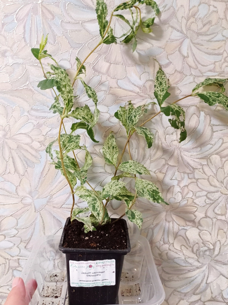 Особенностью дейции шершавой Мармораты является ее уникальный окрас листьев. Великолепный мраморный рисунок, сочетающий в себе оттенки зелёного и белого, с преобладанием последнего. К тому же, сорт неспроста назван шершавым, поверхность листьев имеет легкий мелкий пушок.