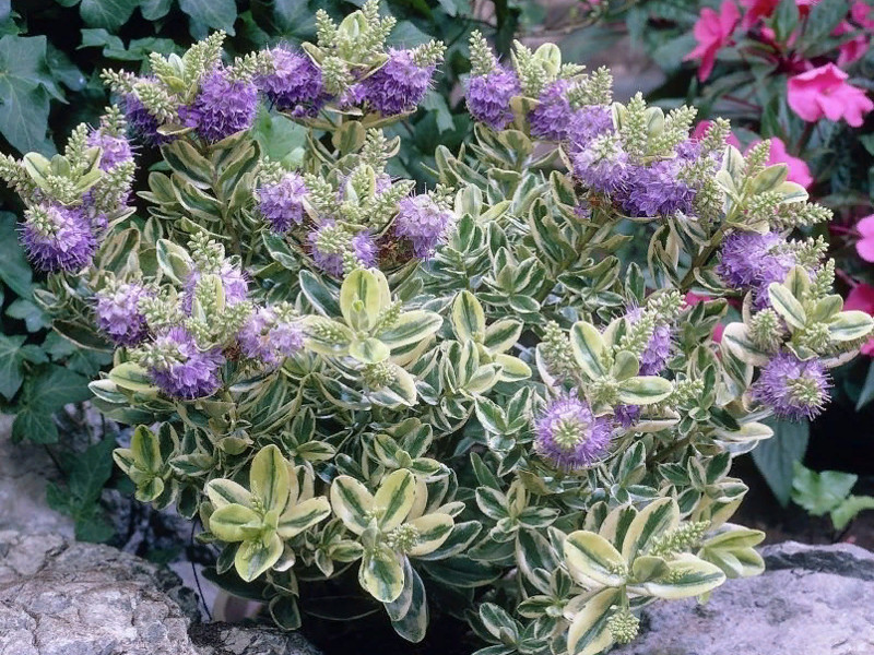 Зацветает хебе вариегатный летом, формируя в вертикальных пазушных кистях чрезвычайно нежные и красивые лиловые цветки, собранные в соцветия. Растение создает в саду настоящие райские уголки, оно отличается чрезвычайной декоративностью в течение всего года, быстрым ростом и долгим непрерывным цветением. Единственный минус — низкая морозоустойчивость.