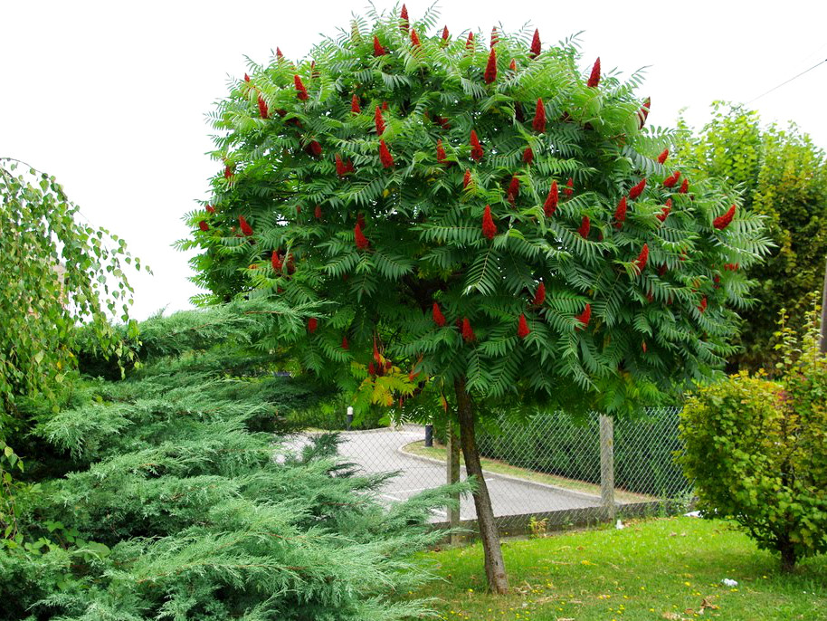Сумах очень колоритное дерево, его любят и просто садоводы, и ландшафтные дизайнеры. Дерево от природы имеет такую красивую форму, поэтому Вы не тратите время на её поддержание. Зимы он выдерживает с понижением температуры до – 30, главное, чтобы был хороший снежный покров. В ином случае необходимо утеплить сеном, листьями или иным укрывным материалом. Если подмёрзнут некоторые ветки, о Вы их просто обрежете весной, молодые побеги быстро нарастают, замещая пустоты. Может поражаться мучнистой росой, необходима мгновенная обработка при заражении и удаление испорченных листьев. Так же если листья сохнут, то необходимо проверить кору на наличие повреждений. В других случаях дерево совершенно не приносит хлопот, а лишь радует долгие годы.