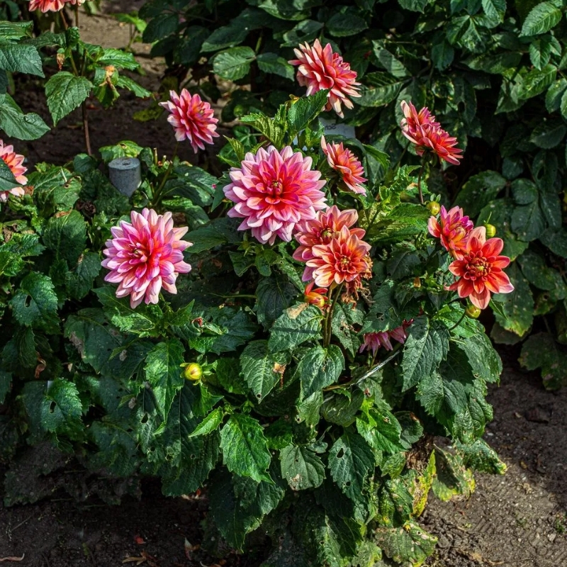 Уход за георгинами включает регулярный полив, подкормки и формирование куста. Поливают растения обильно, но нечасто, ориентируясь на погоду и состояние почвы: застой воды недопустим. Подкормки начинают через 2–3 недели после посадки, чередуя органические и минеральные удобрения. В начале роста акцент делают на азот, с появлением бутонов — на фосфор и калий. Чтобы цветки были крупные - удаляют боковые побеги (пасынкование), чтобы увеличить количество соцветий - прищипывают главный побег над 4-ой парой листьев. Не забывайте убирать сухие соцветия, чтобы куст выглядел опрятно.Выкопка георгинов на зиму