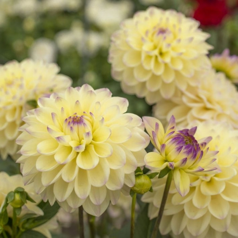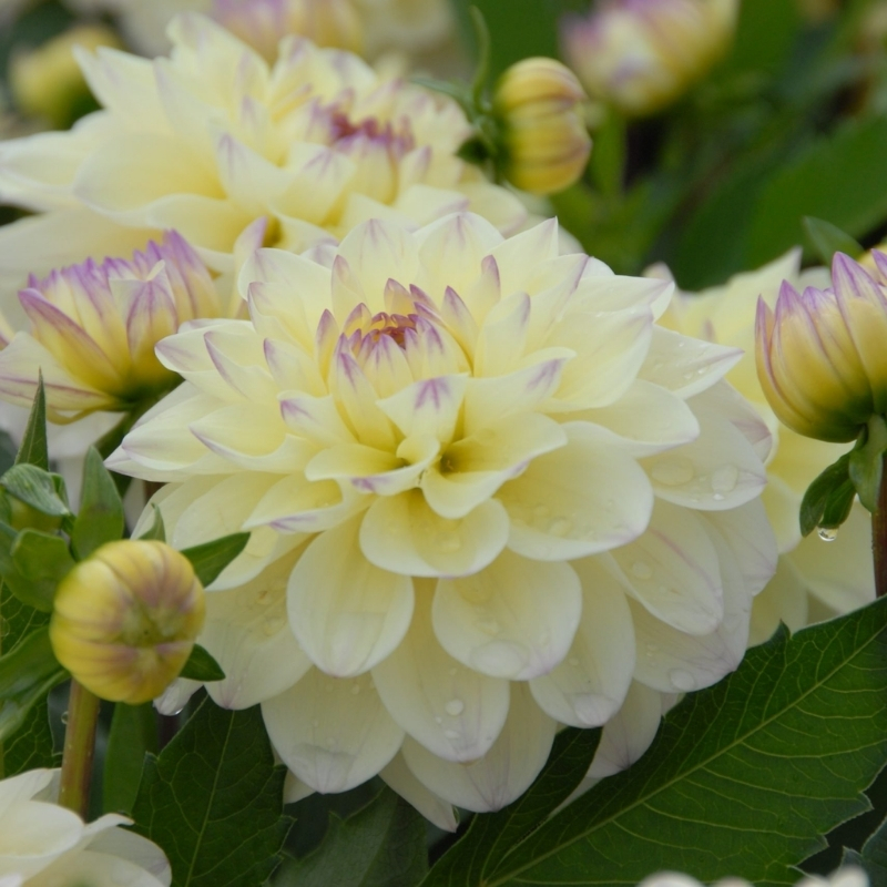 Есть у данного сорта лёгкая изюминка, которая привлекает к себе внимание - пурпурные кончики. Особенно заметны они в период бутонизации, когда лепестки сомкнуты и кажется, будто половина цветка фиолетового цвета. Но стоит им раскрыться, как предстает желто-кремовый нежный цветок, который лишь слегка прихвачен пурпурным сиянием. Цветки округлые, махровые, диаметром 7–12 см. Период цветения обильный и продолжительный с середины лета до первых осенних заморозков. Бордюрная георгина Лейк Кери имеет прямостоячую компактную форму куста, высотой 40-60 см. Темно-зеленые листья непарно-перистые, многочисленные. Сорт не обладает выраженным ароматом, не зимует в открытых условиях, имеет высокую устойчивость к заболеваниям и даёт хорошие срезочные цветы.Универсальность и применение в саду:
