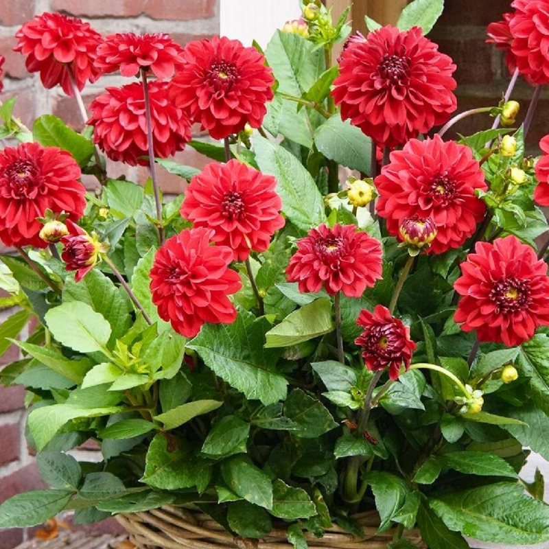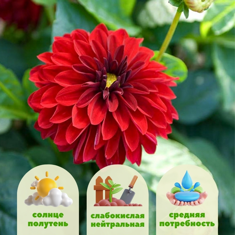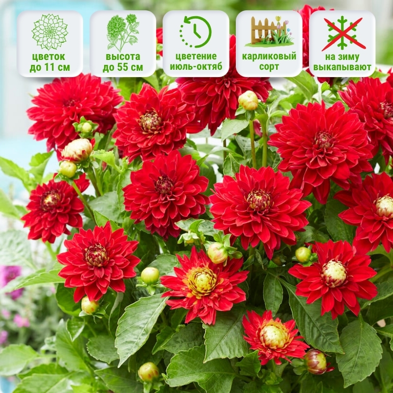 Данный бордюрный сорт не превышает высоты в 55 см, что делает его отличным выбором для переднего плана цветников и рабаток. Цветки яркие, насыщенного красного цвета, который становится глубже и темнее к середине бутона, там где лепестки не до конца раскрылись. Но как только цветок полностью раскроется (ближе к завершению своего цветения), он обнажит золотой контрастный центр. Диаметр у цветков примерно 9-11 см, они раскрываются дружно и держатся прямо на прочных крепких стеблях даже после дождя. Период цветения обильный и продолжительный — с середины лета до осенних заморозков, обеспечивает непрерывный декоративный эффект. Жителям южного региона рекомендовано высаживать георгины в местах, где в дневное время присутствует легкая тень. Не морозостойкое растение, требует выкопки на зиму.Универсальность и применение в саду: