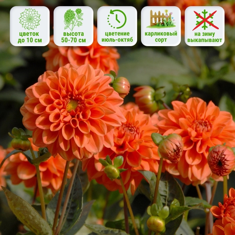 Данный сорт относится к низкорослым бордюрным формам, куст обычно развивается до 50–70 см в высоту, плотный и аккуратный. Цветки насыщенного оранжевого оттенка, состоят из многочисленных вогнутых лепестков, которые собирают в себе тени, играющие с движением солнечных лучей. Цветки средне-крупные примерно 10 см, образуют яркие шарики на фоне насыщенной зелени листвы. Период цветения обильный и продолжительный — с середины лета до первых осенних заморозков. Аромата у цветков нет. Не зимостойкое растение.Универсальность и применение в саду: