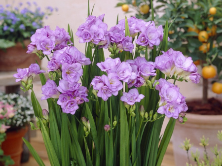 Махровая голубая фрезия (Freesia Blue) относится к семейству ирисовых. Превосходная, голубая фрезия расцветает в мае и радует весь летний сезон, ни кого не оставляя равнодушным к своей красоте.