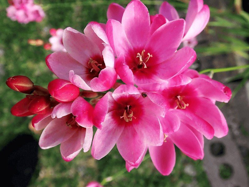 Период цветения иксии Панорама приходится на июнь-август в зависимости от срока посадки. Необыкновенный цветок образует соцветие на котором распускается 10-12 звездчатых, нежно- розовых с темно-красным основанием цветков, диаметром 3-5 см, с приятным ароматом. Распускается «букет» иксии Panorama на прочном цветоносе высотою 35-50 см, листья мечевидные, зеленые, расположены двурядно. Продолжительность цветения иксии Панорама 2-3 недели, в срезке сохраняет свежий вид до 10-15 дней.