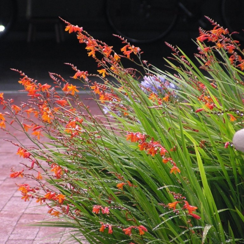 Crocismia grandiflora органично вписывается в самые разные ландшафтные сценарии: от ярких клумб и бордюров до групповых комбинаций вдоль дорожек и контейнерного украшения террас и балконов. Крокосмия хорошо смотрится на фоне зелени хвойников, камней, в сочетании с другими многолетниками - канной, лилейником, злаками и др. Кроме того, благодаря вертикальному росту и выразительным соцветиям, она часто используется как живой фон для более низких растений. Рекомендуется высаживать группами по 12 и более штук.Посадка крокосмии и уход за ней: