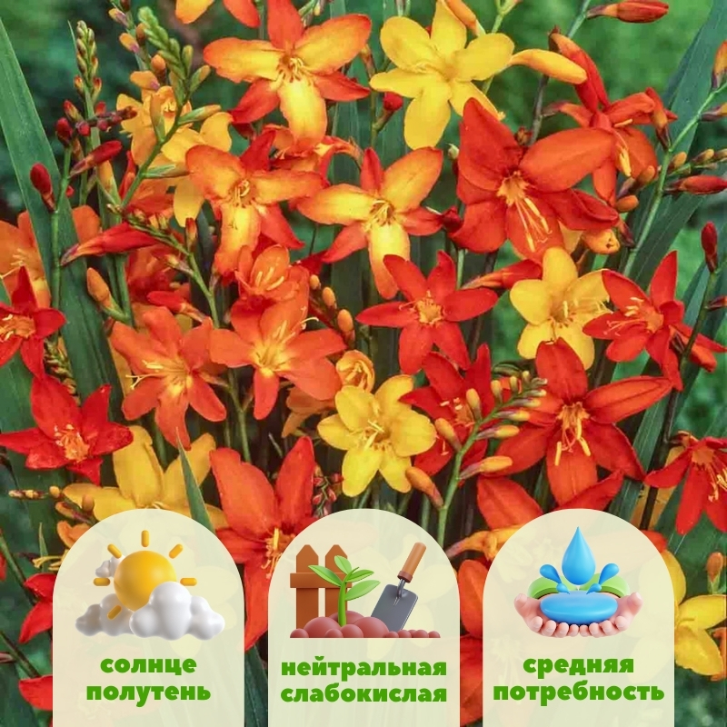 Экзотическая палитра, родом из Африки, готова проявить свою силу в вашем саду. Крокосмия крупноцветковая смесь доставит с собой энергию света и огня, и создаст выразительный летний акцент.