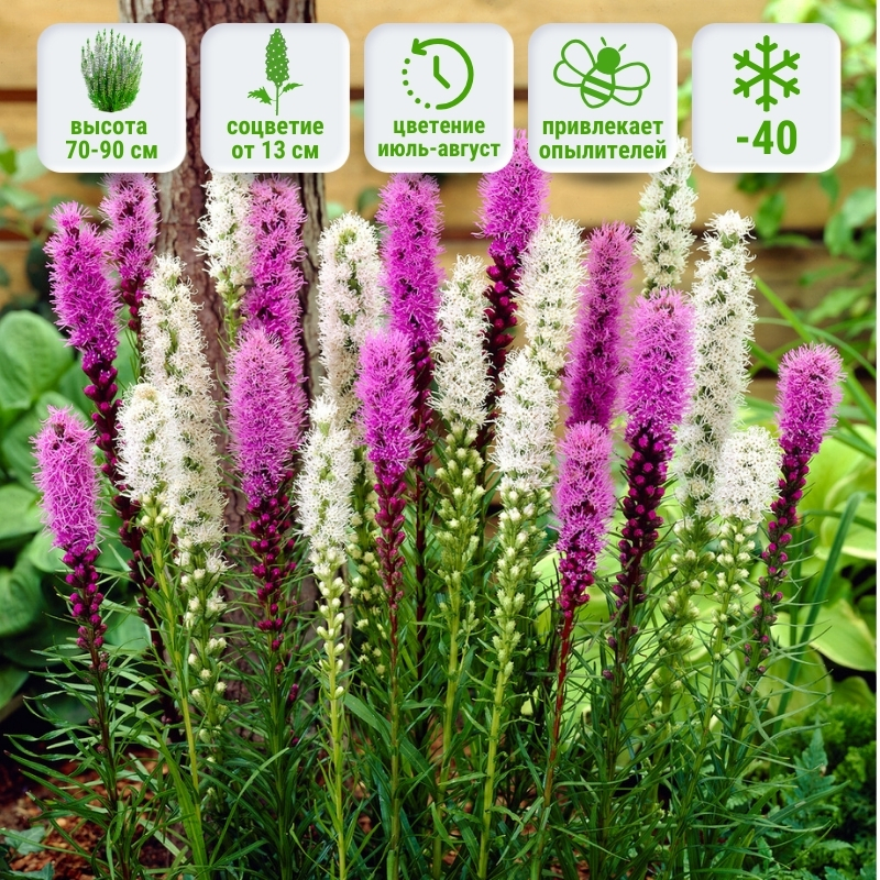 Этот набор из 5 шт - пленительный дуэт, состоящий из чистого белого и царственного фиолетового оттенков, обещает наполнить ваш сад завораживающим сочетанием цвета и изысканности. Идеально подходящие для бордюров, клумб или в качестве очаровательных фокусных точек, эти луковицы предлагают безупречное сочетание красоты и устойчивости. Лиатрис отличается высокими стройными колосьями, украшенными звёздчатыми цветами, которые цветут сверху вниз, а не наоборот, как это делают другие колосовидные растения. Зацветает многолетник в июле и цветёт на протяжении 4-5 недель. Пушистые шпили имеют стройный и высокий побег в 70 см. Усыпан он узкой супротивной листвой, которая из зеленого летнего наряда переходит в бронзовый осенний.После цветения цветоносы можно убрать, а можно оставить сухоцвет на корм птицам до прихода зимы. Хотя лиатрис не отличается ароматом, его визуальная привлекательность компенсируется изяществом и очарованием. Привлекает опылителей, таких как пчелы и бабочки, что делает его благоприятным дополнением к вашему саду. Зимостойкость высокая -35⁰С, практически не подвержен болезням, устойчив к жаре, но не переносит тяжелых глинистых почв и нуждается в постоянном поливе!