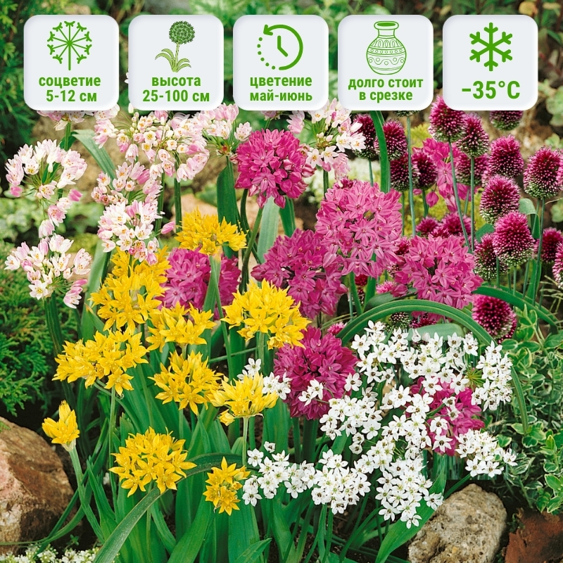 В состав набора входят луковицы декоративных луков разных видов и сортов, актуальных на момент комплектации. В одной упаковке представлено не менее трёх сортов, по несколько луковиц каждого, что обеспечивает разнообразие форм и сроков цветения. Высота растений варьируется от 30 до 100 см, соцветия — шаровидные или полушаровидные. Период цветения, в зависимости от видов, приходится на конец весны и начало лета. Allium обладают лёгким характерным ароматом, хорошо переносят весенние похолодания и отличаются высокой декоративностью в срезке и сухих букетах.Универсальность и применение в саду: