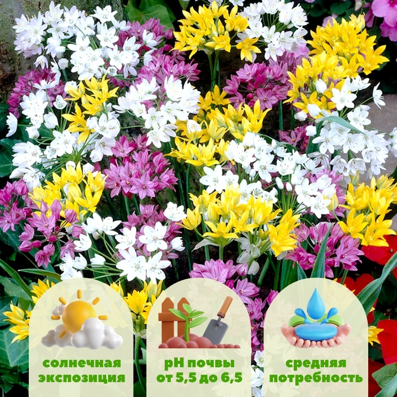 В ландшафтном дизайне смесь декоративных луков особенно ценится за универсальность. Её используют в миксбордерах, природных цветниках, вдоль дорожек, в групповых посадках и на фоне многолетников. Разная высота позволяет создавать многоярусные композиции без дополнительных растений, а смена оттенков делает посадку живой и динамичной. Такая смесь отлично сочетается с тюльпанами, нарциссами, декоративными злаками, пионами и многолетниками с крупной листвой, помогая создать выразительный, но сбалансированный садовый акцент.Рекомендации по посадке аллиума и уходу за ним: