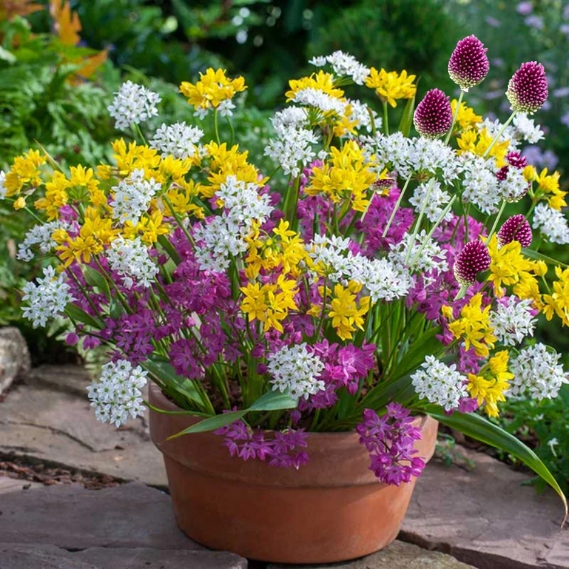 Лук декоративный смесь (10 шт) — это готовый способ добавить в сад динамику, объём и живую игру красок без сложного подбора растений. Главная особенность этой смеси — непредсказуемая, но всегда гармоничная палитра: фиолетовые, синие, розовые, белые и жёлтые соцветия распускаются в разное время и на разной высоте, создавая эффект продуманной дизайнерской композиции.