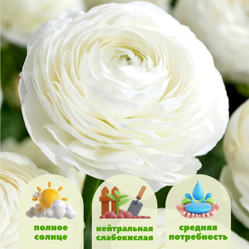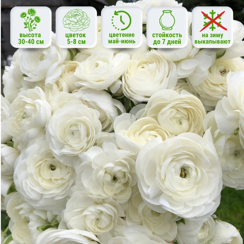 Ранункулюс Белый (White) — относится к семейству лютиковых, его необычные, крупные цветки, размером с кулак, напоминают маленькие розы, а при роспуске изящные маки. Белые лютики производят неизгладимое впечатление при высадке на клумбах, рабатках, эффектно выглядят в бордюре, пригоден для выращивания в качестве горшечного растения для окон и балконов.