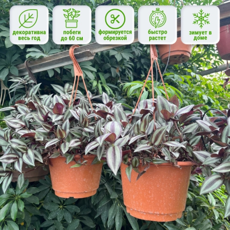 Традесканция полосатая — одно из самых универсальных комнатных растений. Её можно выращивать в кашпо, подвесных корзинах, настольных композициях или в террариумах. Особенно эффектна она в ампельной форме — струящиеся вниз побеги придают пространству движение и глубину. Благодаря своей текстуре и яркой окраске она удачно сочетается с декоративнолиственными растениями: монстерой, сансевиерией, папоротниками. Часто используется как почвопокровное или бордюрное растение в контейнерных композициях. Традесканция висячая — идеальный выбор для тех, кто ищет яркое, быстрорастущее и при этом неприхотливое растение для украшения интерьера или балкона.Посадка и уход за традесканцией: