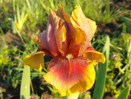 Германский ирис Апачи Уорриор – простой способ украсить любой цветник. Благодаря богатому цвету и крупному цветку в 13-15 см, он смотрится броско в любом уголке сада. Состоит из шести округлых лепестков желто-оранжевого цвета с коричнево-бордовыми язычками у основания и апельсиновой бородкой. Высок, его стебли около 60-70 см. Цветение наступает уже в начале лета в июне, заряжая сад своей энергетикой и наполняя ароматом.