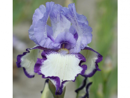 Ирис бородатый Chinquanq зацветает в мае-июне, образуя шикарные цветущие кусты с необычными цветами. Верхние гофрированные лепестки бородатого ириса Чинкуан имеют пестрый бело-голубой окрас, а нижние лепестки окрашены насыщенно-сине-фиолетовыми мазками по краям и белоснежной серединой. Кончики лепестков изящно изогнуты, придавая цветам ириса этого сорта пышный, летящий вид. Период цветения бородатого ириса Chinquanq 2-4 недели, на протяжении которых сладкий аромат этого растения наполнит ваш сад. Ирисы, или как по другому их называют, петушки, вырастают 50 см, диаметр куста 35-40 см. Листва широкая светло-зелёного цвета.Ирис германский Чинкуан безоговорочно подходит для создания небольших клумб, идеален и в качестве одиночного куста, прекрасен в срезке, сохраняя свою форму и не увядая 5-10 дней.