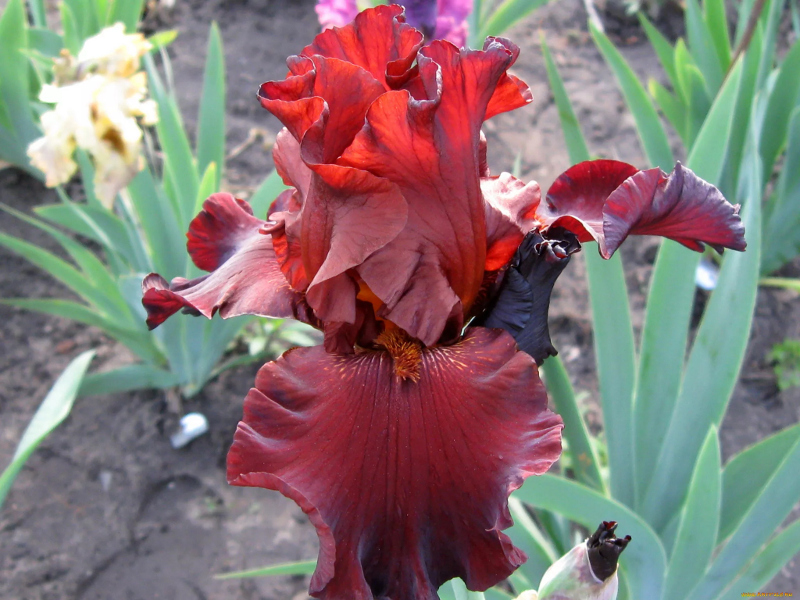 Верхние лепесточки кроваво-красные, собраны в изящный купол, фолы темно-красные с черной опалиной по краю, бородка ярко-желтая. Великолепная форма цветка и сладкий, тонкий аромат способны вскружить голову любому садоводу. Период цветения приходится на май, продолжительность 2-3 недели. Темно-красный ирис распускается на крепком цветоносе высотою до 60 см, листья зеленые, прикорневые. Прекрасно подходит для срезки, широко используется в рабатках, украшении клумб на садовых участках.| Ни для кого не секрет, что каждый цвет воспринимается по разному, красный вызывает возбуждение и волнует, для того чтобы у Вас получилась гармоничная клумба с красно-жёлтым ирисом, расположите с ним рядом белые пионы, белый цвет нейтрален и ненавязчив, он будет контрастировать и вносить нотку нежности, немного успокаивая. Создайте контрастные цветовые пятна, использовав на 1 м. кв. 3-5 ирисов и 2 куста пионов. |