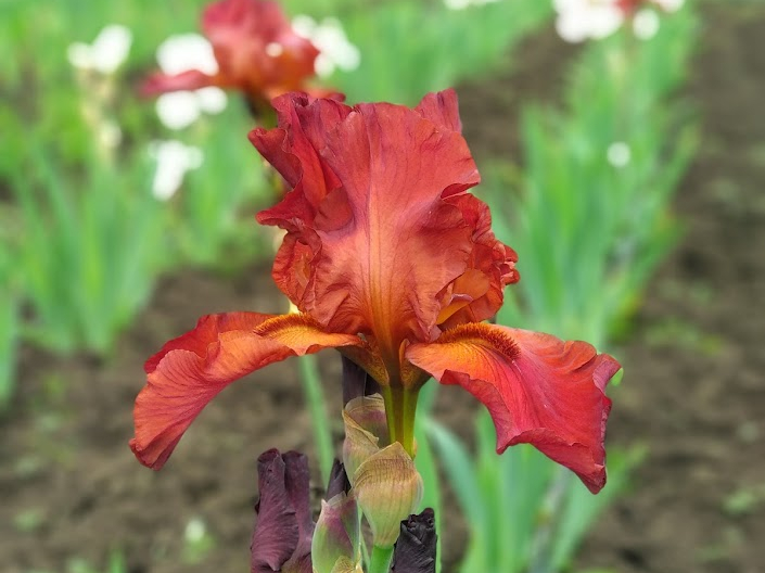 Верхние лепесточки кроваво-красные, собраны в изящный купол, фолы темно-красные с черной опалиной по краю, бородка ярко-желтая. Великолепная форма цветка ириса Sultan's Palace и сладкий, тонкий аромат способны вскружить голову любому садоводу. Период цветения приходится на май, продолжительность 2-3 недели. Темно-красный ирис Султан Пэлас распускается на крепком цветоносе высотою до 60 см, листья зеленые, прикорневые. Прекрасно подходит для срезки, широко используется в рабатках, украшении клумб на садовых участках.