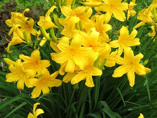 Своими цветоносами лилейник Атен достигает 70см. Цветки диаметром до 14см напоминают лилии, издают приятный аромат. Листочки околоцветника яичного-желтые, широкие, по краям мелкогофрированные. Кусты зарождают многочисленные бутоны, которые сменяют друг друга ежедневно. Цветение обильное в июле-августе, повторно цветущий.