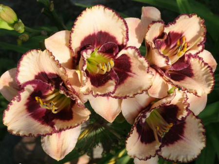 Лилейник Бордер Мьюзик среднего срока цветения, его бутоны начинают распускаться с конца июля и цветут на протяжении 1-1,5 месяцев, образуя кремово-белый цветок с темно-вишневой взъерошенной каймой и того же цвета глазом, контрастно подчеркнутым зеленым горлом.