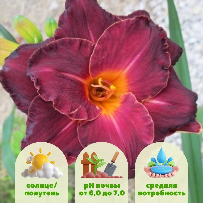 Для посадки лилейника выкапывают лунку до 20-30 см глубиной, заполняют ее торфом или перегноем, добавляют фосфорно-калийные удобрения и высаживают деленку. Место посадки нужно обязательно хорошо утрамбовывать и пролить, чтобы обеспечить высокую приживаемость. Корни лилейника при посадке сильно не заглубляют, достаточно 3-5 см. Место посадки мульчируют листьями или древесной корой. Зимуют лилейники в любом регионе, для их укрытия подойдет небольшой слой мульчирования, а выпавший снег доделает остальное.Для отправки корней лилейника Burgundy Love (Бургунди Лав) используется стандартный корень в надежной упаковке, благодаря чему растение придет живым и полным сил.