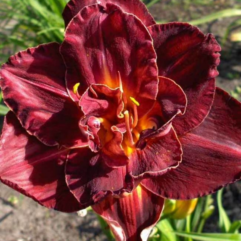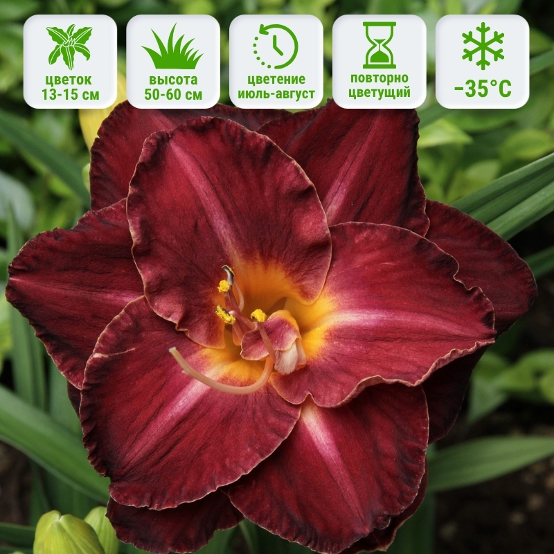 Максимально эффектен лилейник Бургунди Лав в период массового расцвета, и пусть продолжительность жизни цветка не более одного дня, количество раскрываемых изо дня в день новых бутонов оставляют незамеченным данный факт. Как правило, первые бутоны начинают появляться в июне и продолжают цвести в течении месяца. Цветок лилейника Burgundy Love обладает роскошным терпким винным цветом, по структуре махровый с ярко-жёлтым горлышком и тычинками, достаточно крупный, так диаметр около 15 см.| Не меньшую привлекательность носит куст, который состоит из мечевидной листвы, очень густой. Всего высотой лилейник Бургунди Лав 45-55 см, потому разместить Вы его сможете с любыми декоративными многолетниками, на фоне ярких гладиолусов или же среди вечнозелёных можжевельников. |