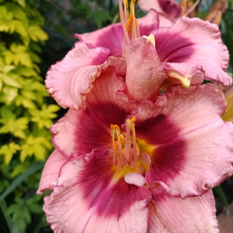 Куст мощный высотой около 60–70 см, с плотной зелёной листвой, сохраняющей декоративность весь тёплый сезон. Цветки крупные 11-14 см в диаметре, с характерным волнистым краем лепестков. Они окрашены в приятный розовый цвет и украшены малиново-красным кольцом с ярким жёлто-золотым горлом. Цветение обильное, начинается в июле, с возможным повторным (ремонтантным) цветением в августе. Тетраплоидный лилейник отличается отличной зимостойкостью и неприхотливостью: переносит жару, временную засуху и не требует укрытия на зиму. Зимостойкость до –35°C.Универсальность и применение в саду: