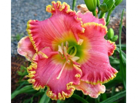Лилейник Дивас Чойс зацветает в июле на 1,5-2 месяца, удивляя всех своими необычными кораллово-розовыми цветами с желтыми сильно гофрированными краями и зеленым горлом. Лилейник Дивас Чойс яркий, повторно цветущий сорт с крупными цветами диаметром до 17 см. На одном цветоносе этого растения распускается 2-4 бутона, создавая прекрасный «букет» лилиевидных цветов.