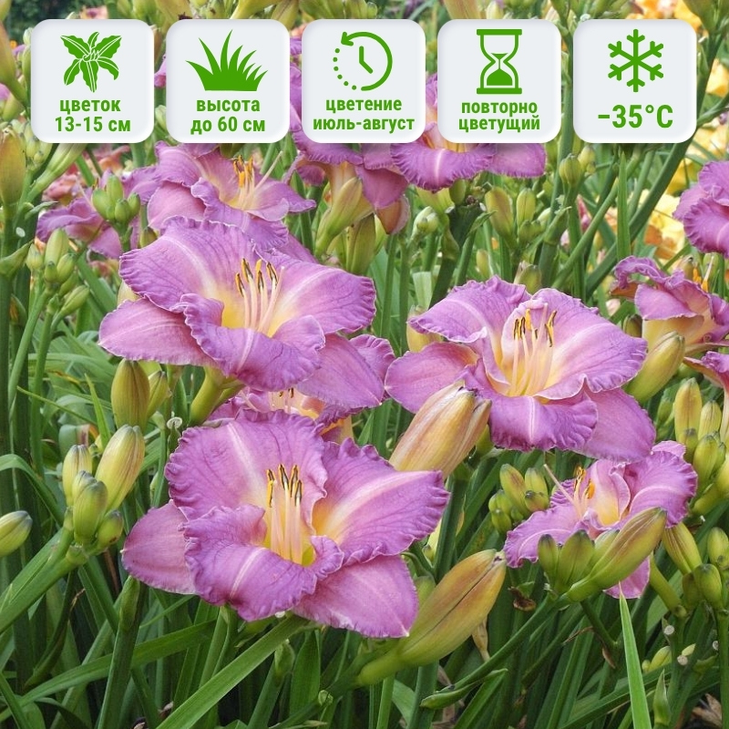 Куст мощный и густой, высотой около 60 см с плотными тёмно-зелёными листьями, создающими аккуратный фон для роскошных цветоносов, ширина его многолетника 45-60 см. Цветки достигают 13–15 см в диаметре, обладают выразительным контрастом между сиреневым венчиком и горлом, которое отливает золотисто-зелёным цветом. Цветение обильное дважды за сезон: сначала в июле, а затем в августе. Этот диплоидный лилейник отличается высокой зимостойкостью до –35°C, устойчивостью к болезням и засухе, не требует сложного ухода. Для сохранения привлекательности листвы необходим обильный полив.Универсальность и применение в саду: