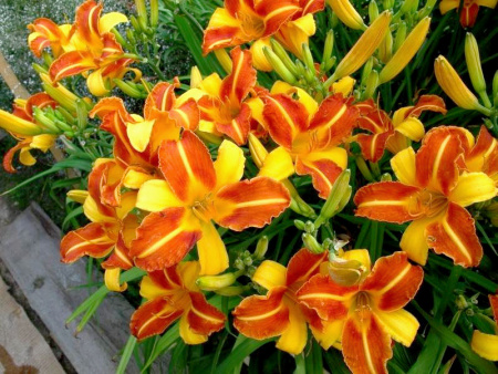 Цветоносы лилейника Франс Холс достигают 40-58см, и в июне-августе они увенчиваются двуцветными граммофонами диаметром 14см с едва уловимым ароматом. Три внутренних листочка околоцветника, которыми и примечателен лилейник этого сорта, красные с желтой серединной жилкой. Три наружные – чисто желтые.