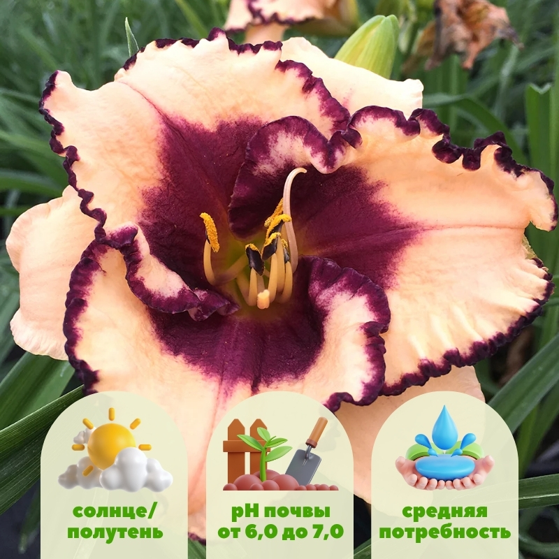 Гибридный сорт образует мощный куст высотой около 45-55 см с длинными ремневидными листьями, создающими плотную зелёную куртину. Цветы крупные до 12–14 см в диаметре, с волнистыми лепестками, окрашенными в оттенки сливового и абрикосового, с ярким солнечным центром. Цветение начинается в июле и продолжается до августа, отличаясь стабильностью и возможным повторным цветением в регионах с теплой осенью. Сорт зимостоек (до –35 °C), не требует укрытия и прекрасно адаптируется к климату средней полосы. Не ароматный.Универсальность и применение в саду: