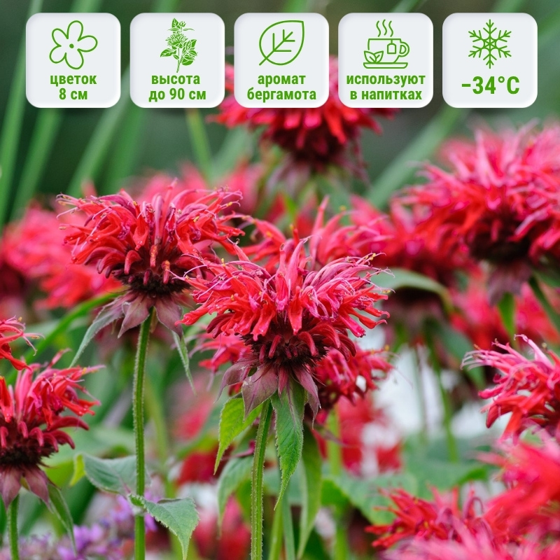 Насыщенные красные цветы, похожие на роскошные короны, создают атмосферу страсти и энергии. Головчатое соцветие диаметром 6-7 см. Цветение длится с середины лета до начала осени. Этот травянистый многолетник достигает 90 см в высоту и примерно 50 см в ширину. Зимостойкость монарды гибридной Кембридж Скарлет позволяет ей переносить температуры до -34°C (зоны 4–9). Дикий бергамот устойчив к вредителям, привлекает пчел и бабочек.Использование в саду: