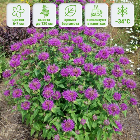 Её роскошные пурпурно-фиолетовые соцветия, напоминающие экзотические короны, буквально притягивают взгляд. Диаметр цветка до 7 см. Цветение приходится на июль-август, даря вашему саду насыщенные фиолетовые оттенки в самый разгар лета. Бергамот Прейринахт достигает высоты до 140 см, формируя густые, вертикально ориентированные кусты. Листва темно-зеленая, с приятной текстурой, которая сохраняет декоративность весь сезон. Растение зимостойкое, выдерживает до -34 °C (зона 4), что делает его подходящим для самых разных регионов. Его цветы и листья обладают сильным пряным ароматом, привлекающим пчел, бабочек и даже колибри.Универсальность в саду