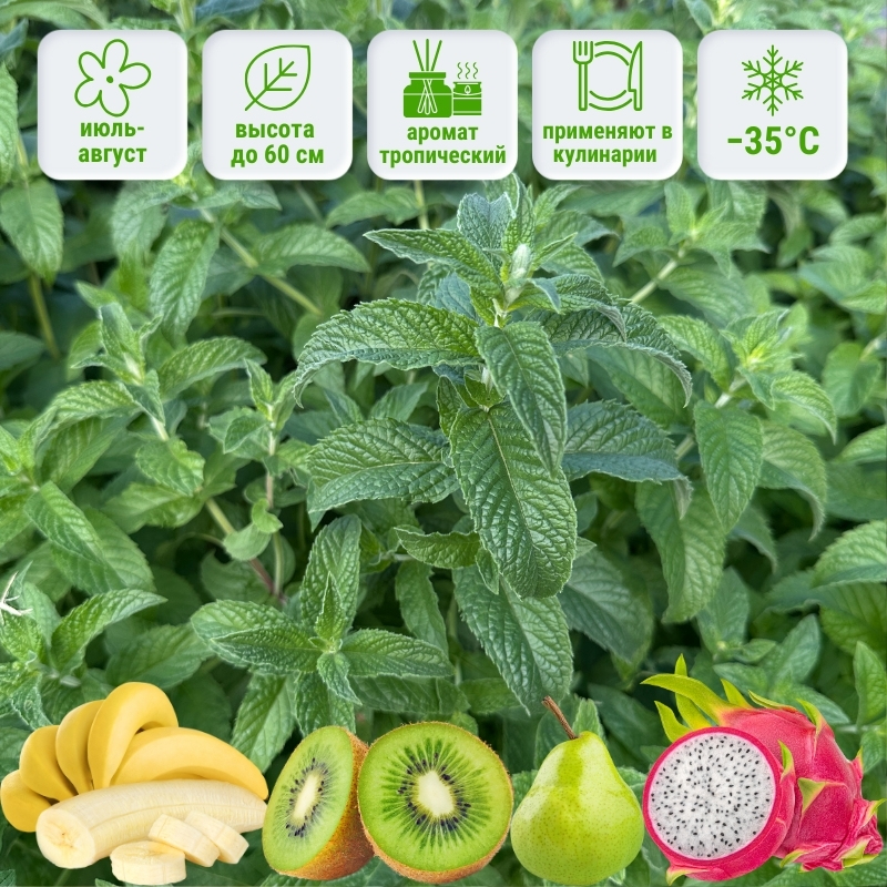 Щедрое лето итак дарит нам множество вкусовых и ароматических ощущений, но эта мята переносит нас в эпицентр жарких тропиков. Гастрономическая коллекция вкусов умещается в одном густом зеленом кусте высотой 40-60 см. Аромат средне-ментоловый, но доминируют сладкие фруктовые шлейфы. Листья зеленые, крупные, хорошо наполняют куст. Растение отзывчиво к стрижке, с каждым разом становится всё гуще и краше. Цветёт в июле-августе нежно-сиреневыми соцветиями. Засухоустойчива, зимостойка до -35 °C, отлично себя чувствует как на открытом солнце, так и в лёгкой тени.Применение в саду и быту: