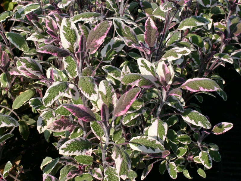 Ему приписывают множество знахарских ритуалов, а о целебных свойствах знали ещё в древнем мире. В наше время эта культура дорога нам, в большей степени, как необычное украшение участка, но нередко используется и в кулинарии. Округлый полукустарник около 60 см в высоту и около 40 см ширину. Особенность сорта, необычная листва, основной цвет которой зеленый, а кант бело-желтый. Лепестки на макушке куста, как правило, фиолетовые. В июне-июле на коричневых стройных цветоносах появляются фиолетово-голубые цветочки, собранные в ветвистые соцветия. Эти цветки и являются важным компонентом растения, их высушивают и используют в медицине и косметологии.