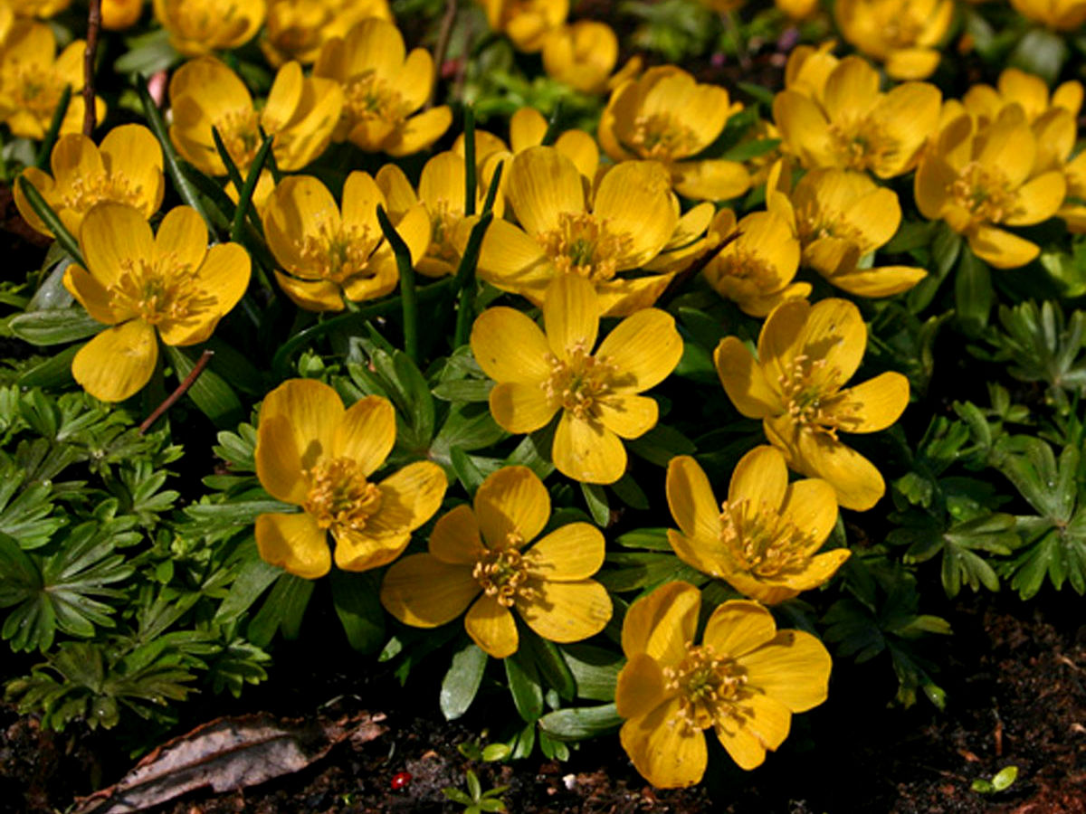 Второе названия эрантиса – «Весенник». Только первые тёплые лучи касаються земли, как происходит нечто невероятное. Ярко-желтые цветки тут и там распахивают свои бутоны. Весенник весьма незамысловатое растение, которое образуется на небольших побегах по одному, цветок состоит из 5-8 шт лепестков, листки прикорневые тёмно-изумрудные. Растение в высоту достигает 10 см, отчего его часто можно заметить при оформлении альпийских горок и прочих низкорослых цветочных инсталляциях.