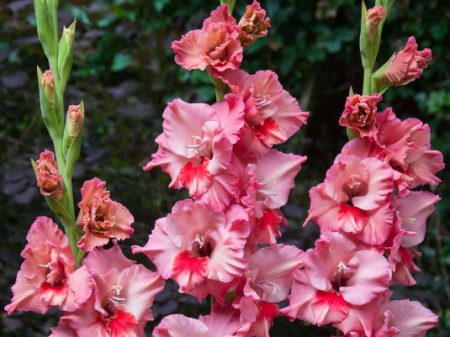 Колос гладиолуса Bernardo Frizzle состоит из 8-9 раскрытых цветков и 10-12 шт полу- и закрытых бутонов. Что примечательно, в нераскрывшихся цветках присутствуют бледно-персиковые или телесные оттенки, а в полностью распущенных лишь нежно-розовый, на нижнем лепестке малиновый язычок. Многие страстно любят данный сорт за гофрированные витиеватые цветки диаметром около 10 см.