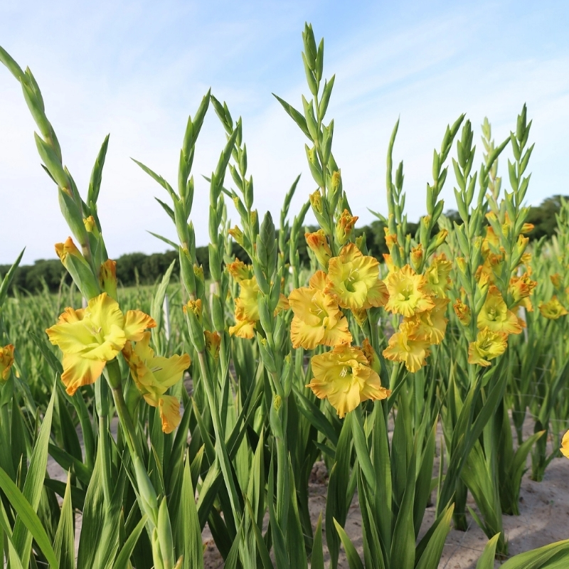 Крепкий цветонос достигает высоты от 80 до 120 см. Листья у него типичные для гладиолусов — узкие, мечевидные, зелёные, создающие строгий, стройный фон. Цветки крупные 10-15 см бодрящего желтого цвета, который к горлу зеленеет, а к кончикам лепестков становится оранжевым. Лепестки гофрированные, чем усиливают красоту цветка. Расцветает в середине или во второй половине лета, от посадки до цветения 90-100 дней.Универсальность и применение в саду: