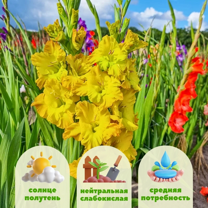 Gladiolus Blitz особенно хорош в дуэте с многолетниками мягких фактур: астильбами, геранью, декоративными злаками, чистецом шерстистым. Яркие колосья великолепно контрастируют с крупными блюдцами белых лилий, синим шалфеем и вероникой. В миксбордерах его можно использовать как «цветовую вышку» среди спокойных зелёных масс хост, бузульника или гейхеры. А в букетах гладиолус Блиц гармонично сочетается с эхинацеей, рудбекией и георгинами, усиливая их оттенки и создавая эффектную, живую композицию.Посадка гладиолусов Блиц и уход за ним: