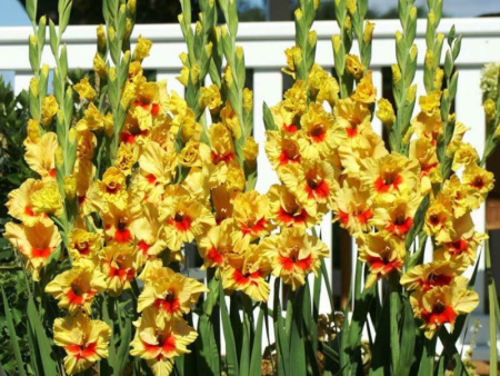 Гладиолус Джестер (Jester) – привлекает взгляды своей жизнерадостной яркостью! Его удлиненные соцветия, словно солнечные лучи, переливаются насыщенными оттенками жёлтого с огненно-красным пятном в центре.