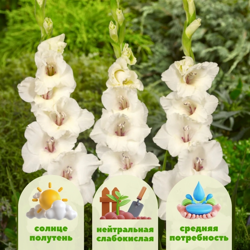 Лёгкое напоминание о кружащих хлопьях снега и морозных украшениях на окнах - снежноокрашенные гладиолусы Флево Эскимо (Flevo Eskimo). Для моно-клумб, трогательных букетов, белых вершин в центре сада - выносливые и неприхотливые цветы.