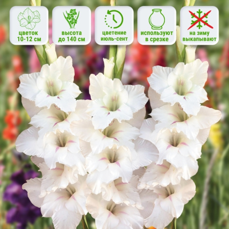 У данного гладиолуса мощный, высокий стебель 120-140 см, формирующий аккуратный стройный силуэт. Подчеркнуть цветение и создать фон помогают узкие мечевидные листья тёмно-зелёного цвета. Бутоны раскрываются в крупные 10-12 см, эффектные цветки свежего белого цвета с едва заметными узкими полосами розового цвета, которые выглядывают из узкого горла. Цветение приходится на середину и вторую половину лета, будет зависеть от погоды и времени посадки, продлится до 2-х недель.Универсальность и применение в саду: