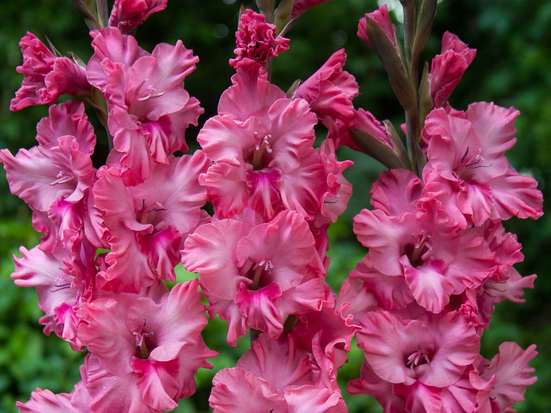 Вы не сможете пройти мимо этого красавца, ведь высотой он 120 см. Гладиолус Kingston Frizzle стремительно рос и возносил цветки ввысь, чтобы представить их небывалую красоту. Карминово-розовые бутоны вспыхивают один за одним в пышных соцветиях. Каждый цветок не менее 10-13 см в диаметре. На нижнем лепестке виднеется малиновое пятно. Очень интересна форма цветка из-за вертлявости и гофрированности лепестков.