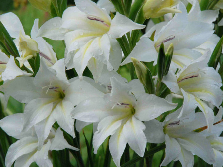Этот необычный вид гладиолусов имеет совершенно очаровательные цветки. Белоснежные соцветия состоят из 10-14 бутонов. Лепестки аккуратные, плавных линий, серединка каждого окрашена лёгким салатовым пятном. Миниатюрные цветки гладиолуса Альбус не превышают 6 см в диаметре.Главное преимущество таких гладиолусов заключено в очень раннем сроке цветения, наступающем уже в начале лета и продолжающемся более 15 дней.
