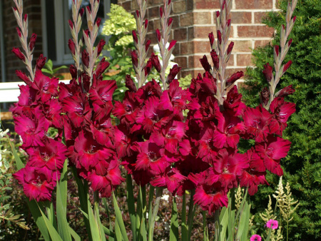 Вырастает гладиолус Плум Тарт к июлю до 120см. Цветки 12-14 см в диаметре, формируют широкое соцветие. Лепестки гладиолуса этого сорта бархатистые, насыщенного глубокого красного цвета у основания и малиново-фиолетового цвета по краям с легкой гофрировкой.| Высаживайте луковицы гладиолуса Plum Tart по 10-12 шт рядом с белыми и очень светлыми сортами, чтобы подчеркнуть его яркость. В саду отведите им место на фоне сочной зелени хвойных или вечнозелёных кустарников по типу самшит. Гладиолус Плум Тарт очень хорош в срезке, не нуждается ни в каких дополнениях для создания шикарного букета, если только в небольшом количестве ажурной зелени.